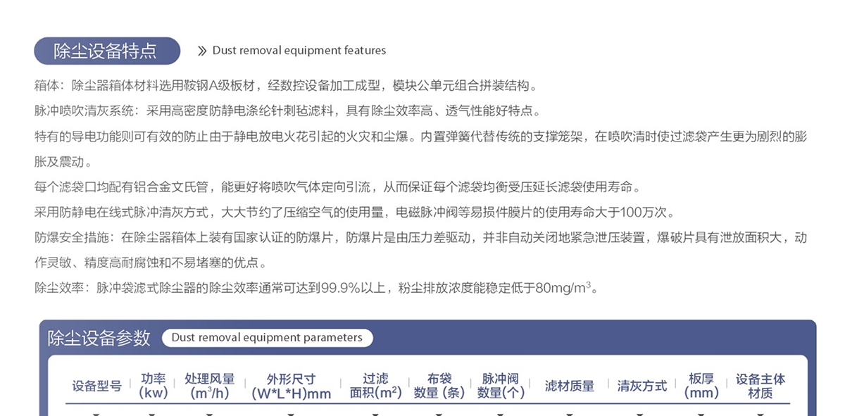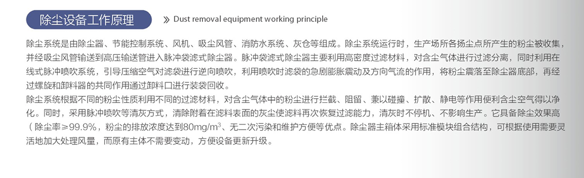 簡介:除塵系統(tǒng)是由除塵器、節(jié)能控制系統(tǒng)、風機、吸塵風管、消防水系統(tǒng)、灰倉等組成。除塵系統(tǒng)運行時,生產場所各揚塵點所產生的粉塵被收集,并經吸塵風管輸送到高壓輸送管進入脈沖袋濾式除塵器。脈沖袋濾式除塵器主要利用高密度過濾材料,對含塵氣體進行過濾分離,同時利用在線式脈沖噴吹系統(tǒng),引導壓縮空氣對濾袋進行逆向噴吹,利用噴吹時濾袋的急劇膨脹震動及方向氣流的作用,將粉塵震落至除塵器底部,再經過螺旋和卸料器的共同作用通過卸料口進行裝袋回收